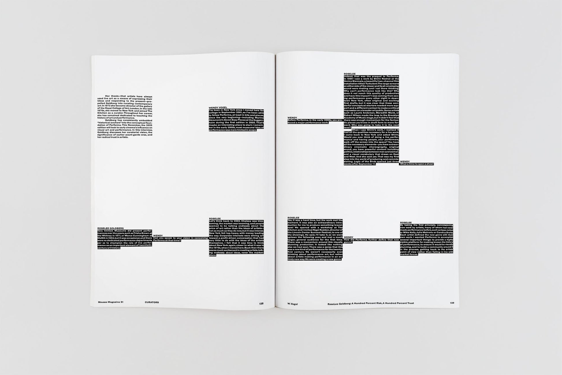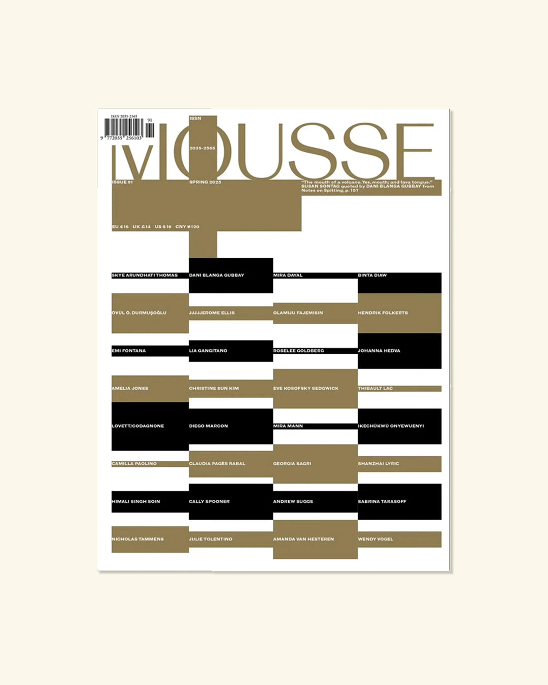 Mousse is a major Italian studio and publishing house that, in addition to its namesake magazine, produces a wide range of compelling literature. Since its launch in 2006, the magazine has established editorial offices in the contemporary art capitals—Berlin, New York, London, and Paris—and features writers who cover the most relevant topics in visual culture today.